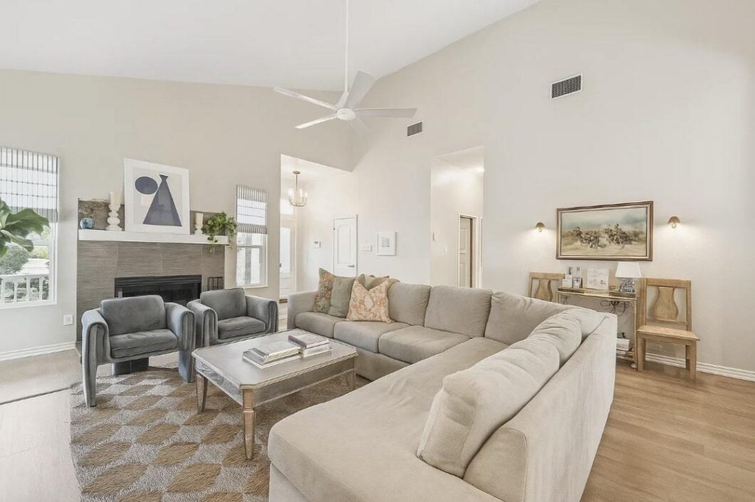 The owner’s suite is a true retreat with high ceilings, offering a spa-like bath with dual vanities, a walk-in shower, a soaking tub, and direct access to the backyard.